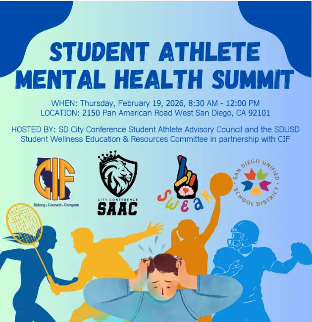 The Student-Athlete Mental Health Summit, hosted by the San Diego City Conference Student-Athlete Advisory Council and CIF, brought together high school student-athletes, coaches, and community leaders for a meaningful day centered on the importance of prioritizing mental health in high school athletics. The summit featured a keynote presentation from Alicia Guerrero, an SDSU student-athlete panel, and interactive workshops focused on topics such as performance pressure, identity, balance, and coping strategies. The event fostered a supportive space to normalize conversations surrounding mental health and emphasized the importance of caring for the whole athlete, on and off the court/field.